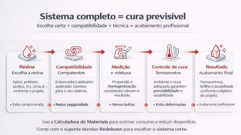 Resina não é tudo igual — e, na prática, o que muda o resultado é a combinação entre tipo de resina, objetivo do projeto e controle do processo de cura. Na Redelease você encontra um portfólio completo para aplicações industriais, artísticas e artesanais, com opções como epóxi, poliéster, acrílica à base d’água, PU (poliuretano), cura UV e resinas para impressão 3D.